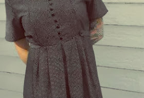 My dress looked like that, except it's navy blue with tiny white polka dots and white buttons. Can I draw your attention to those little strips of fabric on the side?